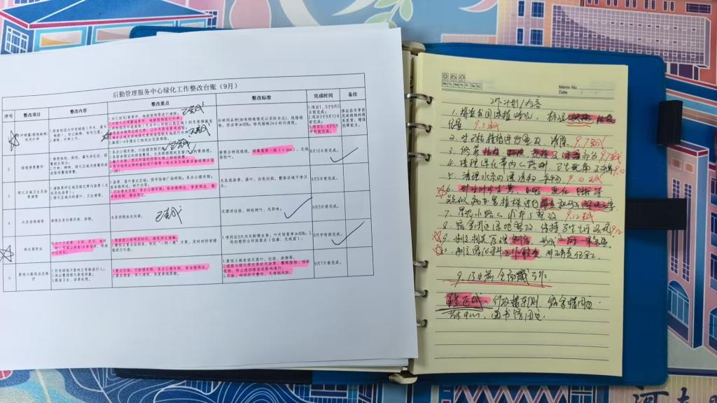 翻开宋龑炜的工作台账,周计划条理清晰、事项推进一目了然。这本日渐厚重的笔记,不仅是他梳理工作的工具,更是他将新思路、新方法融入传统后勤管理的实践缩影。台账上的条目,最终都化为校园里实实在在的改变:从两校区环道树木的修整,到新宿舍楼周边的环境整治;从迎新前的绿化美化,到宿舍区的细致消杀;从商业街食品安全检查,到家属院设施维护……他的足迹所至,即是问题解决之地。如今,他正系统排查全校绿化植被,着手制定整体提质方案,推动工作从“被动应对”向“主动规划”跃升。